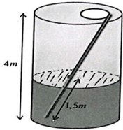 Một bồn chứa nước hình trụ bằng bê tông cao 4 mét, đặt vuông góc với măt đất, chỉ chừa một nắp nhỏ bên ngoài để bơm nước vào bồn, trong bồn có sẵn một lượng nước. Để đo chiều cao mực nước trong bồn người ta có cách đo như sau: Lấy một cây sào tre có chiều cao 5 mét nhúng vào thùng nước sao cho có một đầu chạm đáy và một đầu chạm với mặt trên của bồn nước (như hình vẽ) sau khi rút sào tre thì đo được phần sào tre bị ước là 1,5 mét. Hỏi mực nước trong bồn cao bao nhiêu mét. (làm tròn kết quả đến hàng phần chục)