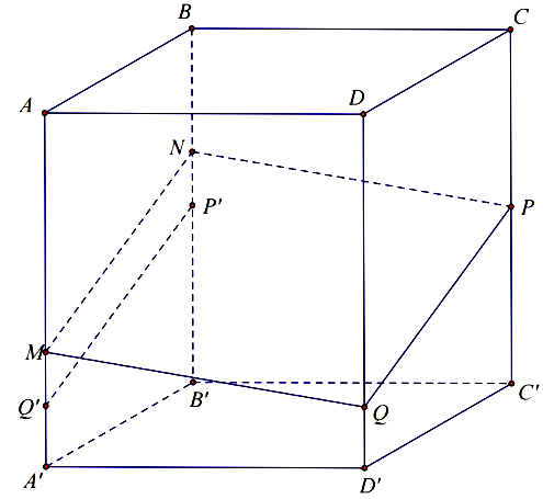 Cho hình hộp \(ABCD \cdot A'B'C'D'\). Trên các cạnh \(AA';BB';CC'\) lần lượt lấy ba điểm \(M,N,P\) sao cho \(\dfrac{{A'M}}{{AA'}} = \dfrac{1}{3};\dfrac{{B'N}}{{BB'}} = \dfrac{2}{3};\dfrac{{C'P}}{{CC'}} = \dfrac{1}{2}\). Biết mặt phẳng \(\left( {MNP} \right)\) cắt cạnh \(DD'\) tại \(Q\). Tính tỉ số \(\dfrac{{D'Q}}{{DD'}}\).