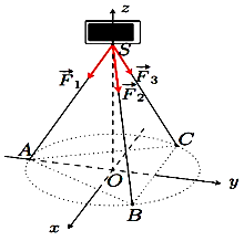 Một chiếc điện thoại iphone được đặt trên một giá đỡ có ba chân với điểm đặt \(S\left( {0;0;20} \right)\) và các điểm chạm mặt đất của ba chân lần lượt là \(A\left( {0; - 6;0} \right),B\left( {3\sqrt 3 ;3;0} \right),C\left( { - 3\sqrt 3 ;3;0} \right)\) (đơn vị cm ). Cho biết điện thoại có trọng lượng là 2 N và ba lực tác dụng lên giá đỡ được phân bố như hình vẽ là ba lực \({\vec F_1},{\vec F_2},{\vec F_3}\) có độ lớn bằng nhau. Biết tọa độ của lực \(\overrightarrow {{F_1}} = \left( {a;b;c} \right)\), khi đó \(T = 2a + 5b + 6c\) bằng?