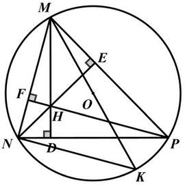 Cho \(\Delta MNP\,\,(MN < MP)\) có ba góc nhọn nội tiếp đường tròn \((O).\) Ba đường cao \(MD,NE,PF\) của \(\Delta MNP\) cắt nhau tại \(H\,\,(D \in NP;E \in MP;F \in MN)\). Kẻ đường kính \(MK\) của đường tròn \((O).\)