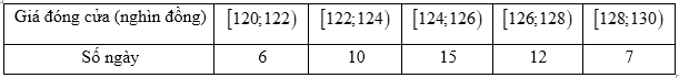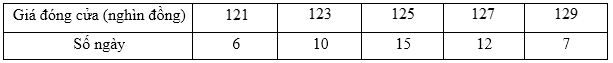 Giá đóng cửa của một cổ phiếu là giá của cổ phiếu đó tại thời điểm cuối mỗi phiên giao dịch. Bảng sau thống kê giá đóng cửa (đơn vị: nghìn đồng) của mã cổ phiếu X trong 50 ngày giao dịch liên tiếp.