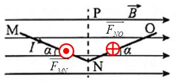 Hai dây dẫn thẳng MN và NO được nối với nhau tại N và có dòng điện chạy theo chiều từ MNO với cường độ I. Hệ thống ở trong một từ trường đều nằm ngang với cảm ứng từ có độ lớn B. Biết MN = NO. Phát biểu nào sau đây là sai?