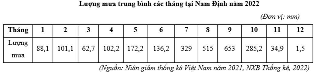 Căn cứ vào bảng số liệu trên, hãy cho biết tổng lượng mưa mùa mưa của Nam Định năm 2022 là bao nhiêu mm (làm tròn kết quả đến hàng đơn vị).