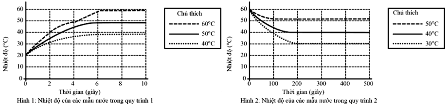 Một nhiệt kế thuỷ ngân, nhiệt độ ban đầu là 20°C, được đặt trong nước có nhiệt độ 40°C, và nhiệt độ này được ghi lại theo thời gian. Quy trình này được lặp lại bằng cách sử dụng các mẫu nước ở 50°C và 60°C (xem Hình 1). Tiếp theo, cùng một nhiệt kế, ở nhiệt độ ban đầu là 60°C, được đặt trong mẫu không khí ở 50°C, và nhiệt độ được ghi lại theo thời gian. Quy trình này được lặp lại bằng cách sử dụng các mẫu không khí ở 30°C và 40°C (xem Hình 2).