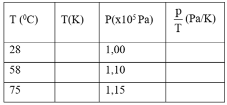 Một học sinh tiến hành thí nghiệm khảo sát sự phụ thuộc của áp suất p theo nhiệt độ tuyệt đối T. Trong đó, bình thủy tinh hình cầu có nút kín, trong có chứa khí được nối thông với áp kế qua một ống nhỏ. Bình thủy tinh được nhúng trong một bình nước, nhiệt độ của nước được đo bởi một nhiệt kế. Đun nóng từ từ nước trong bình rồi ghi lại giá trị nhiệt độ t được chỉ bởi nhiệt kế và áp suất p được chỉ bởi áp kế thu được kết quả ở bảng sau: