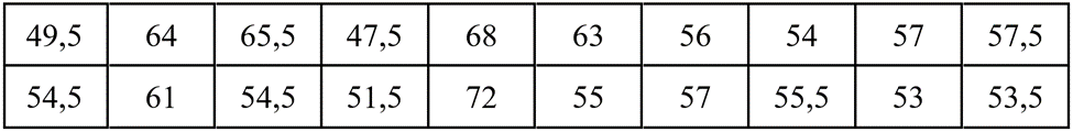 Theo các chuyên gia về chăm sóc sức khỏe thì cân nặng chuẩn độ tuổi học sinh lớp 9 là 47,6 – 52,1 kg đối với nữ và 50,8 – 56 kg đối với nam. Trong một buổi khám sức khỏe tổng quát của lớp, Nguyên Lâm ghi lại cân nặng (tính theo kg) của các bạn học sinh nam lớp 9A8 như sau: