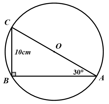 Cho tam giác \(ABC\) vuông tại B có \(BC = 10\;cm\) và \(\angle {BAC} = {30^0}\). Tính bán kính đường tròn ngoại tiếp tam giác \(ABC\).