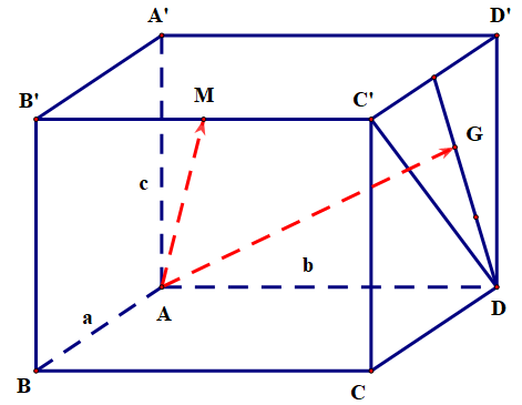 Biểu diễn \(\overrightarrow {AM} \) theo \(\overrightarrow {AA'} ,\overrightarrow {AB} ,\overrightarrow {AD} \) và thay vào biểu thức tính \(2.\overrightarrow {AM} .\overrightarrow {AG} + 5.\overrightarrow {AA'} .\overrightarrow {BD} \).