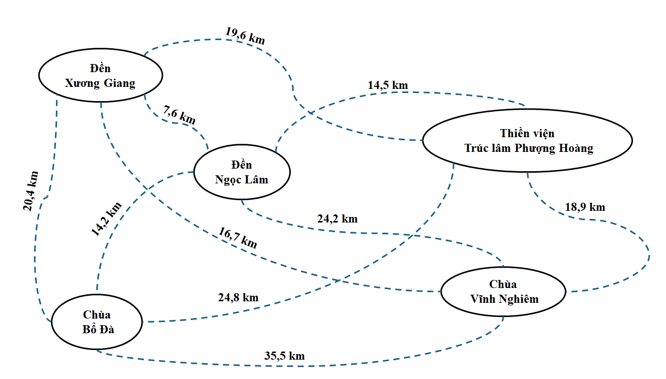 Công ty A có kế hoạch tổ chức tour du lịch tâm linh tại tỉnh Bắc Giang đi qua 5 địa điểm: Đền Xương Giang, Chùa Bổ Đà, Chùa Vĩnh Nghiêm, Thiền viện Trúc lâm Phượng Hoàng, Đền Ngọc Lâm. Hành khách sẽ xuất phát từ Đền Xương Giang và đi thăm mỗi địa điểm đúng một lần. Qua khảo sát thực địa, công ty xây dựng được lược đồ như hình (khoảng cách giữa mỗi cặp địa điểm được ghi trên đường nối). Để tiết kiệm chi phí, công ty dự định chọn tuyến đường có tổng độ dài ngắn nhất. Độ dài của tuyến đường này là bao nhiêu _____ km (làm tròn đến hàng phần mười)