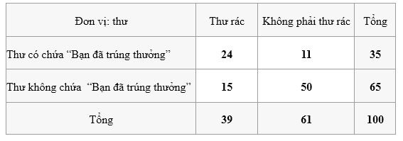 Bạn An muốn kiểm tra xem cụm từ “Bạn đã trúng thưởng” trong Google Mail có phải là cụm từ tốt để lọc thư rác hay không. Google đã chạy một phần mềm thử nghiệm trên người dùng X trong 30 ngày và thu được kết quả bằng cách đếm thủ công như sau: Trong 30 ngày, tài khoản của An nhận được 100 thư điện tử, trong đó có 39 thư rác; 35 thư có chứa cụm từ “Bạn đã trúng thưởng”; 50 thư không là thư rác và chúng cũng không chứa cụm từ “Bạn đã trúng thưởng”. Xác suất chọn 1 thư trong số các thư rác và thư đó chứa cụm từ “Bạn đã trúng thưởng” là ______ (kết quả làm tròn đến hàng phần trăm).