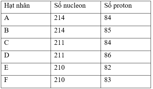Sáu hạt nhân khác nhau có số nucleon và số proton được cho trong bảng sau:
