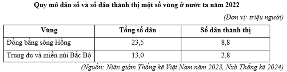 Căn cứ vào bảng số liệu trên, hãy cho biết, năm 2022 tỉ lệ dân thành thị của vùng Đồng bằng sông Hồng cao hơn vùng Trung du và miền núi Bắc Bộ bao nhiêu phần trăm (làm tròn kết quả đến một chữ số thập phân).