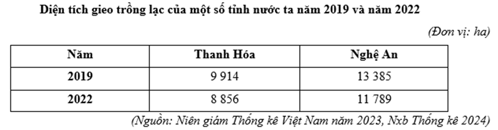 Căn cứ vào bảng số liệu trên, hãy cho biết trong giai đoạn 2019 – 2022, diện tích gieo trồng lạc của Nghệ An giảm nhiều hơn Thanh Hóa bao nhiêu ha.