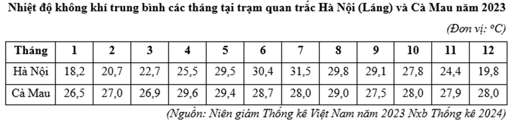 Căn cứ vào bảng số liệu trên, hãy cho biết biên độ nhiệt độ không khí trung bình năm tại trạm quan trắc Hà Nội (Láng) cao hơn biên độ nhiệt độ không khí trung bình năm tại trạm quan trắc Cà Mau là bao nhiêu °C.