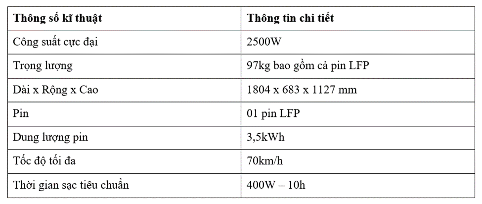 Thông số của xe máy điện Vinfast EVO được cho như sau: