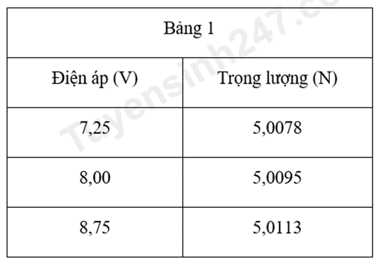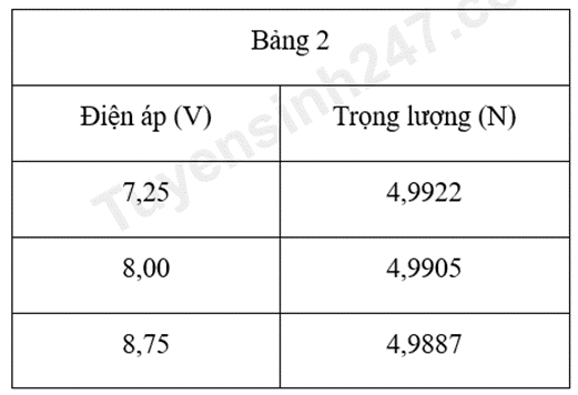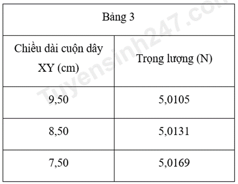 Thí nghiệm 3: Thanh nam châm được đưa trở lại vị trí thẳng hàng ban đầu trong Thí nghiệm 1. Chiều dài XY của cuộn dây điện từ thay đổi khi đặt điện áp 8,00 V vào mạch. Trọng lượng được ghi lại trong Bảng 3.