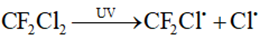 - Tia cực tím phân cắt phân tử CF2Cl2 dể tạo ra nguyên tử (gốc tự do) theo phương trình: