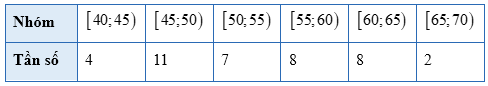 Cho bảng tần số ghép nhóm cho mẫu số liệu về cân nặng của 40 bạn học sinh như hình dưới đây: