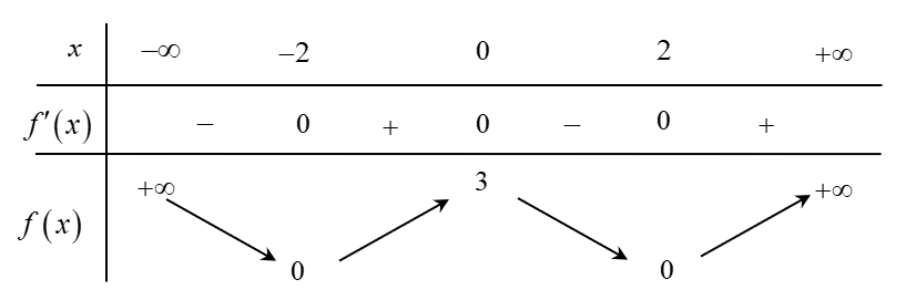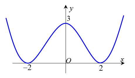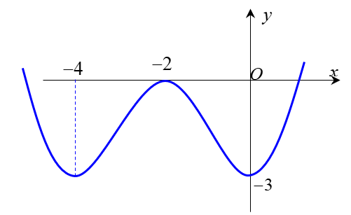Biết hàm số \(y = f'\left( x \right)\) có đồ thị như hình vẽ bên. Biết \(f\left( 0 \right) = 3,\,f\left( { - 2} \right) = f\left( 2 \right) = 0\). Phát biểu nào dưới đây đúng về hàm số \(g\left( x \right) = f\left( {x + 2} \right) - 3\). Chọn các khẳng định đúng.