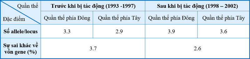 Sự thay đổi trong sự sai khác về vốn gen (%) của quần thể phía Đông trước và sau khi bị tác động là: