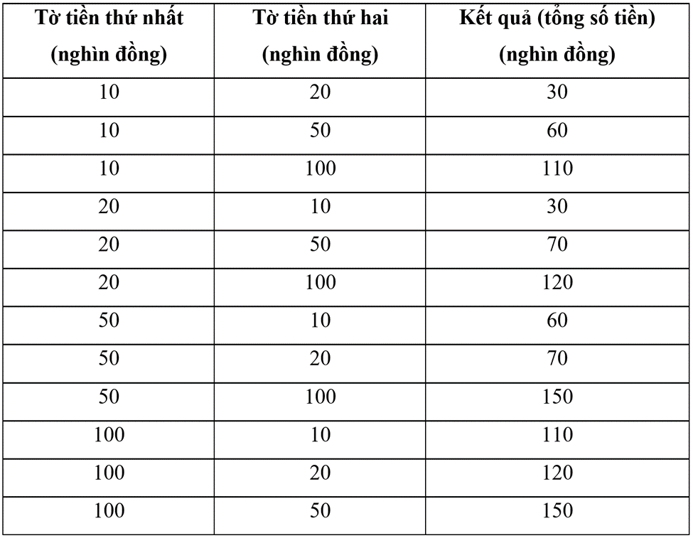 Mẹ đang bận nấu cơm nên đưa ví tiền cho Ngân đi mua thêm một số đồ ăn. Trong ví có 1 tờ 10 nghìn đồng, 1 tờ 20 nghìn đồng, 1 tờ 50 nghìn đồng và 1 tờ 100 nghìn đồng. Sau khi chủ cửa hàng tính tiền, Ngân không nhìn vào ví mà lần lượt lấy ra ngẫu nhiên 2 tờ tiền. Tính xác suất của biến cố A: “Ngân nhận được số tiền nhỏ hơn 100 nghìn đồng”.