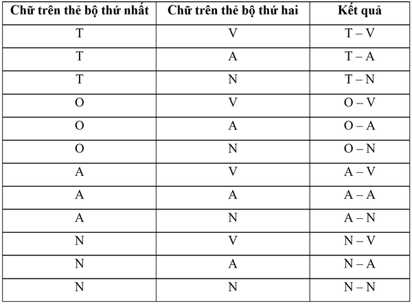 Có hai bộ thẻ, bộ thẻ thứ nhất có 4 tấm thẻ ghi các chữ: T, O, A, N, và bộ thẻ