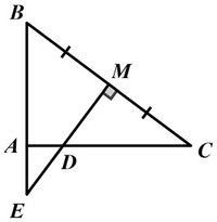 Cho \(\Delta ABC\) có \(AB = 18\;cm,AC = 24\;cm,BC = 30\;cm\). Gọi M là trung điểm của BC. Qua M kẻ đường thẳng vuông góc với BC cắt \({\rm{AC}},\,\,{\rm{AB}}\) lần lượt tại \({\rm{D}},{\rm{E}}\).