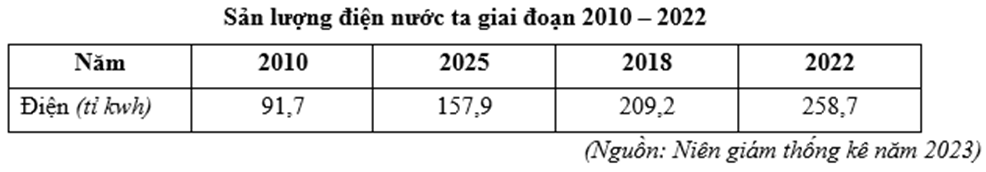 Căn cứ vào bảng số liệu trên, cho biết trong giai đoạn từ năm 2010 đến 2022, trung bình mỗi năm sản lượng điện nước ta tăng thêm bao nhiêu tỉ kwh (làm tròn kết quả đến một chữ số thập phân)