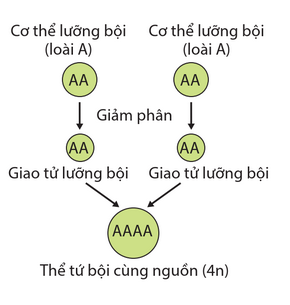 | b) Sự kết hợp giao tử đực 2n và giao tử cái 2n cùng loài trong quá trình thụ tinh hình thành thể tứ bội. |