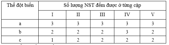 Bộ NST của 1 loài sinh vật có 5 cặp (kí hiệu I, II, III, IV, V). Khảo sát 1 quần thể loài này phát hiện thấy 3 thể đột biến (kí hiệu a, b, c). Phân tích tế bào 3 thể đột biến đó thu được kết quả: