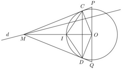 Cho đường tròn \(\left( {O,{\rm{ }}R} \right)\), một đường thẳng \(d\) cố định cắt đường tròn tại hai điểm phân biệt, từ một điểm \(M\) thuộc đường thẳng \(d\) nằm bên ngoài đường tròn kẻ hai tiếp tuyến \(MC,{\rm{ }}MD\) tới đường tròn (\(C,D\) là tiếp điểm).