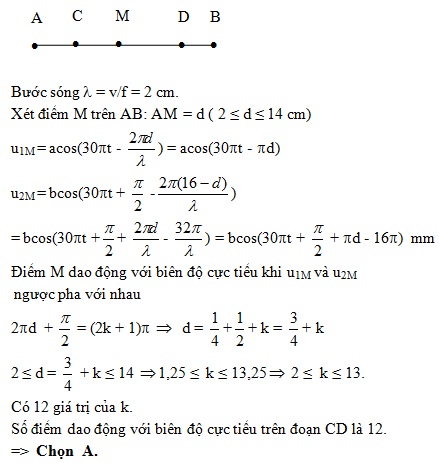 Tốc độ truyền sóng trên mặt nước là 30cm/s. Gọi C, D là 2 điểm trên đoạn AB sao cho AC = DB = 2cm. Số điểm dao động với biên độ cực tiểu trên đoạn CD là: