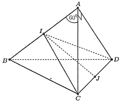 Cho tứ diên \(A B C D\) có \(A B=A C=A D=1\) và \(\widehat{B A C}=\widehat{B A D}=60^{\circ}, \widehat{C A D}=90^{\circ}\). Gọi \(I\) và \(J\) lần lượt là trung điểm của \(A B\) và \(C D\).