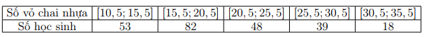 Trong tuần lễ bảo vệ môi trường, các học sinh khối 12 tiến hành thu nhặt vỏ chai nhựa để tái chế. Nhà trường thống kê kết quả thu nhặt vỏ chai của học sinh khối 11 ở bảng sau: