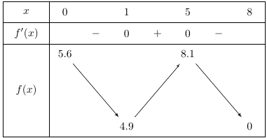 Một hồ nước nhân tạo được xây dựng trong một công viên giải trí. Trong mô hình minh họa, nó được giới hạn bởi các trục tọa độ và đồ thị hàm số \(y = f\left( x \right) = - 0,1{x^3} + 0,9{x^2} - 1,5x + 5,6\). Đơn vị đo độ dài trên mỗi trục tọa độ là \(100m\).