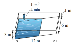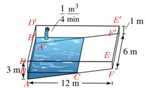 Một hồ bơi được chế tạo từ một khối hộp chữ nhật có chiều dài 12 mét, rộng 6 mét, sâu 1 mét ở đầu nông và sâu 3 mét ở đầu sâu (như hình vẽ). Nước được bơm vào hồ bơi với tốc độ \(0,25\) mét khối mỗi phút. Biết rằng trong bể có 1 mét nước ở đầu sâu. Để lượng nước đạt \(75\% \) dung tích bể bơi thì cần bơm trong thời gian bao lâu? (đơn vị tính bằng phút).