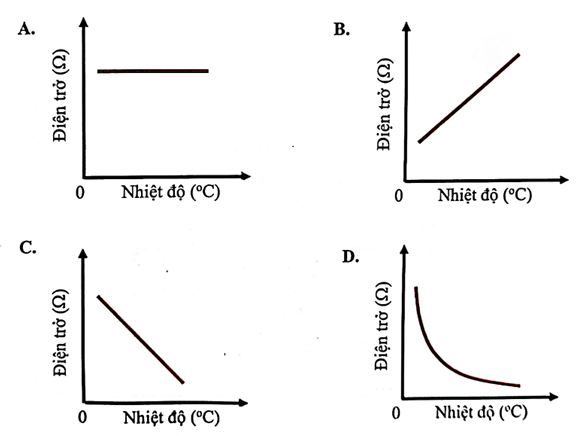 Dạng đồ thị nào sau đây thể hiện gần đúng nhất sự phụ thuộc của điện trở vào nhiệt độ?