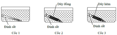 Tiến hành 3 thí nghiệm như hình vẽ sau:Đinh sắt trong cốc nào sau đây bị ăn mòn nhanh