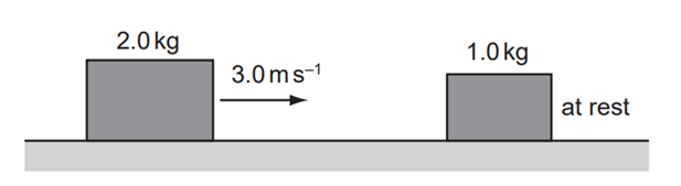 Một vật có khối lượng 2,0 kg di chuyển với tốc độ 3,0 m/s trên một bề mặt không ma sát va chạm trực diện với một vật có khối lượng 1,0 kg đứng yên. Hai vật dính vào nhau khi va chạm.