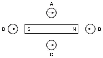 Sơ đồ cho thấy một thanh nam châm và bốn kim nam châm thử. Nam châm thử nào cho biết đúng hướng của từ trường do nam châm tạo ra?
