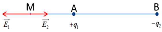 Cho hai điện tích điểm \({q_1} = {6.10^{ - 7}}C\) và \({q_2} = - {8.10^{ - 7}}C\) đặt tại hai điểm A và B trong không khí cách nhau \(5cm\). M là một điểm nằm trên đường thẳng nối hai điện tích sao cho AM = 3cm và BM = 8cm.