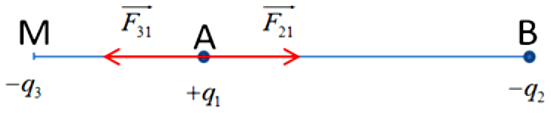 | d) Đặt điện tích \({q_3}\) tại điểm M sao cho lực điện tổng hợp do \({q_2}\) và \({q_3}\) tác dụng lên \({q_1}\) bằng 0. Điện tích \({q_3}\) là điện tích âm. |