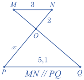 Chứng minh \(\Delta OMN\)~ \({\rm{\Delta }}OQP\) từ đó suy ra cặp đoạn thẳng tỉ lệ và tìm \(x.\)