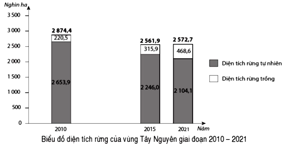 Vẽ biểu đồ thể hiện diện tích rừng của Tây Nguyên, trong đó có diện tích rừng tự nhiên và diện tích rừng trồng giai đoạn 2010 - 2021.