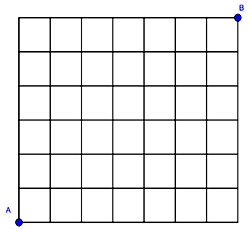 Trên bàn cờ \(6 \times 7\) như hình vẽ, người chơi chỉ được di chuyển quân cờ theo các cạnh của hình vuông, mỗi bước đi được một cạnh. Có bao nhiêu cách di chuyển quân cờ từ điểm A đến điểm B bằng 13 bước? ( điền đáp án vào ô trống).