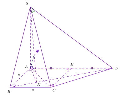 Cho hình chóp S.ABCD có \(SA \bot \left( {ABCD} \right)\), đáy ABCD là hình thang vuông tại A và B, \(AB = BC = \dfrac{1}{2}AD = a\). Biết góc giữa mp \(\left( {SCD} \right)\) và \(\left( {ABCD} \right)\) bằng \({45^o}\).