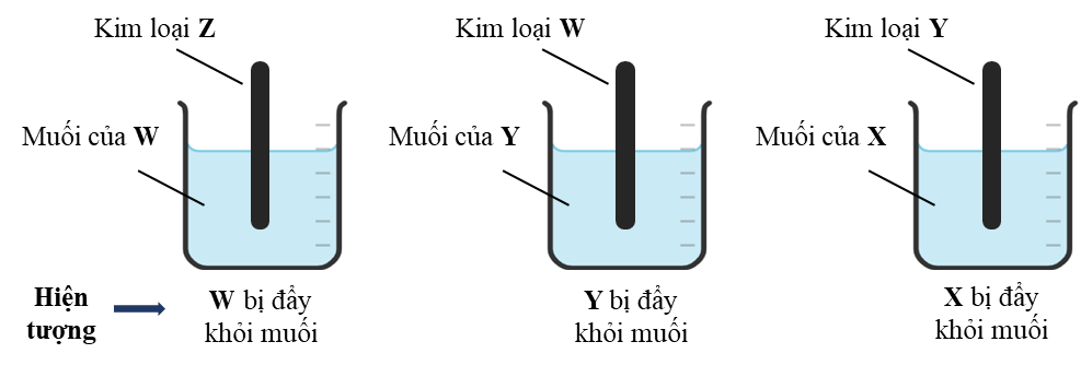Sắp xếp nào dưới đây đúng theo thứ tự giảm dần tính khử của X, Y, Z, W? Biết khi thực hiện phản ứng kim loại tác dụng với muối, thu được kết quả như sau:
