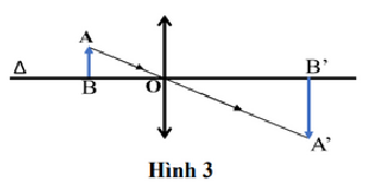 Một vật sáng AB cao 1 cm đặt vuông góc với trục chính, B nằm trên trục chính, cách thấu kính hội tụ một khoảng BO = 10 cm thu được ảnh AB cao 2 cm như Hình 3. Khoảng cách giữa ảnh và thấu kính là