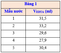 Tiến hành chuẩn độ với 5 mẫu nước, thể tích của dung dịch EDTA đã tham gia chuẩn độ dược ghi trong bảng 1 như sau: