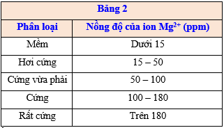 Ion \(M{g^{2 + }}\) trong nước cao gây ra hiện tượng nước cứng, gây ảnh hưởng nhiều đến đời sống. Bảng 2 cho biết thông số để phân loại nước cứng dựa nào nồng độ ion \(M{g^{2 + }}\) như sau: